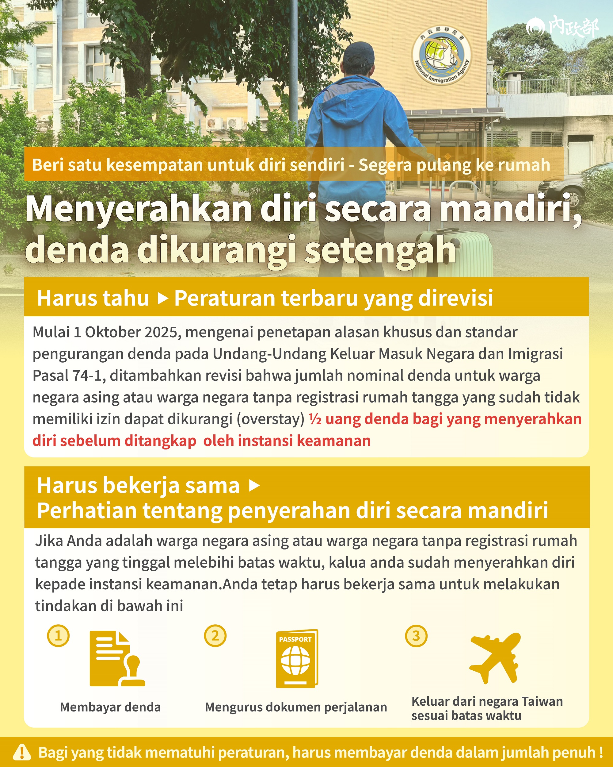 Mulai 1 Oktober 2025, mengenai penetapan alasan khusus dan standar pengurangan denda pada Undang-Undang Keluar Masuk Negara dan Imigrasi Pasal 74-1, ditambahkan revisi bahwa jumlah nominal denda untuk warga negara asing atau warga negara tanpa registrasi rumah tangga yang sudah tidak memiliki izin dapat dikurangi (overstay) ½ uang denda bagi yang menyerahkan diri sebelum ditangkap oleh instansi keamanan