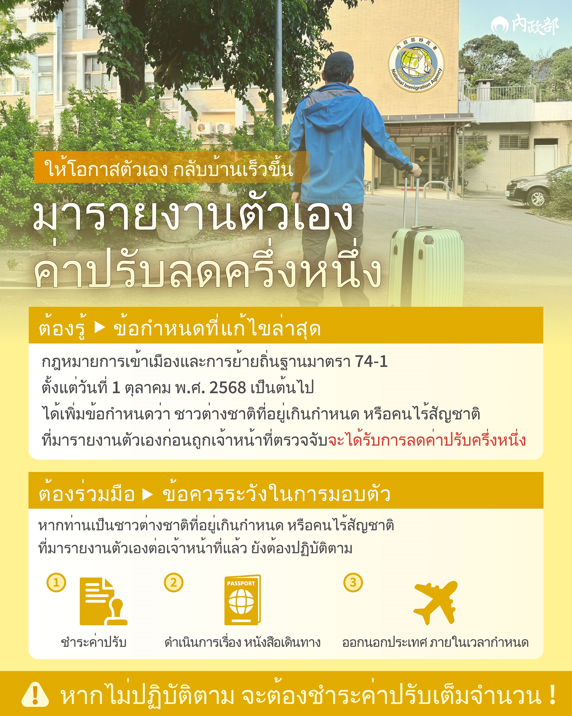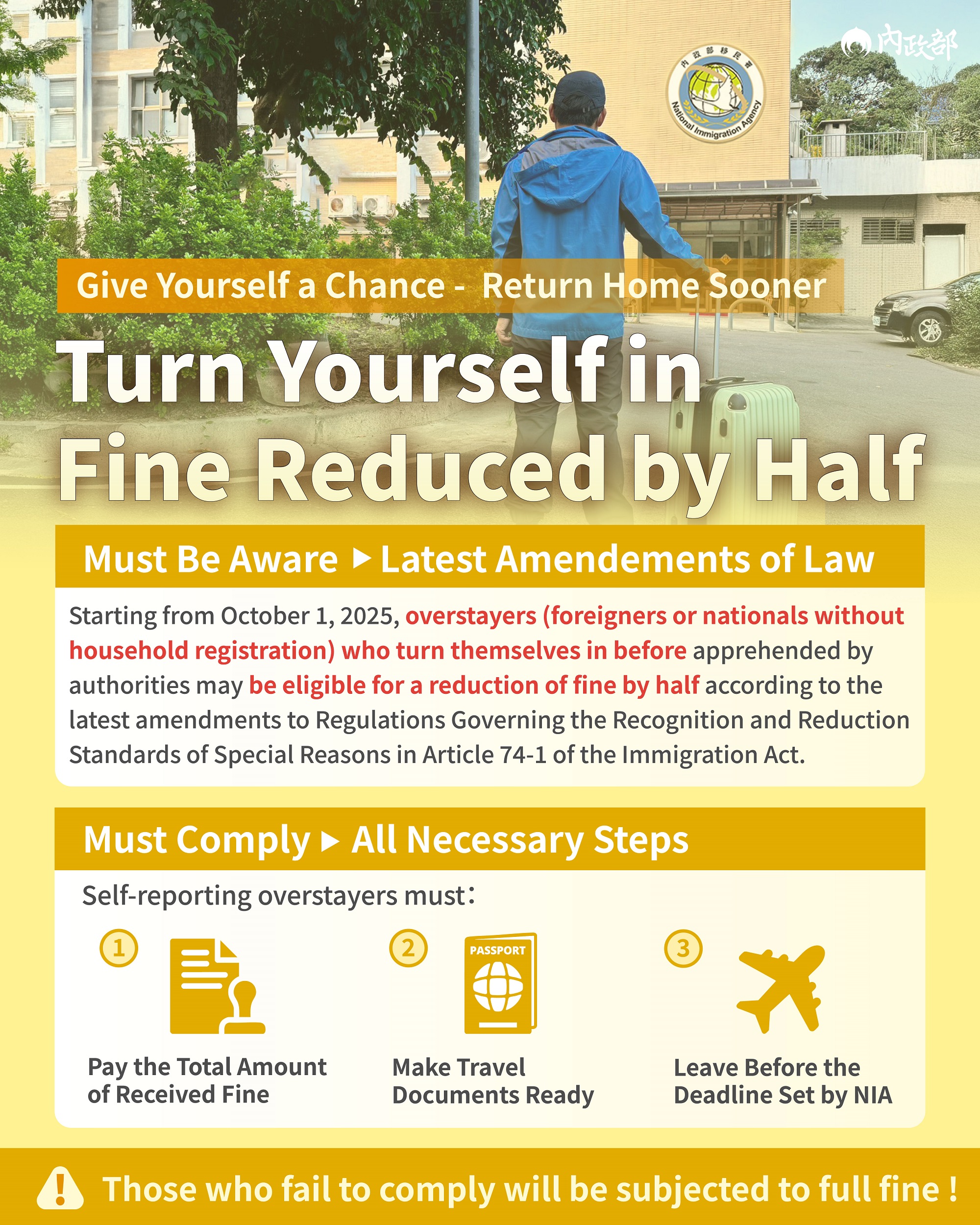 Starting from October 1, 2025, overstayers (foreigners or nationals without household registration) who turn themselves in before apprehended by authorities may be eligible for a reduction of fine by half according to the latest amendments to Regulations Governing the Recognition and Reduction Standards of Special Reasons in Article 74-1 of the Immigration Act.