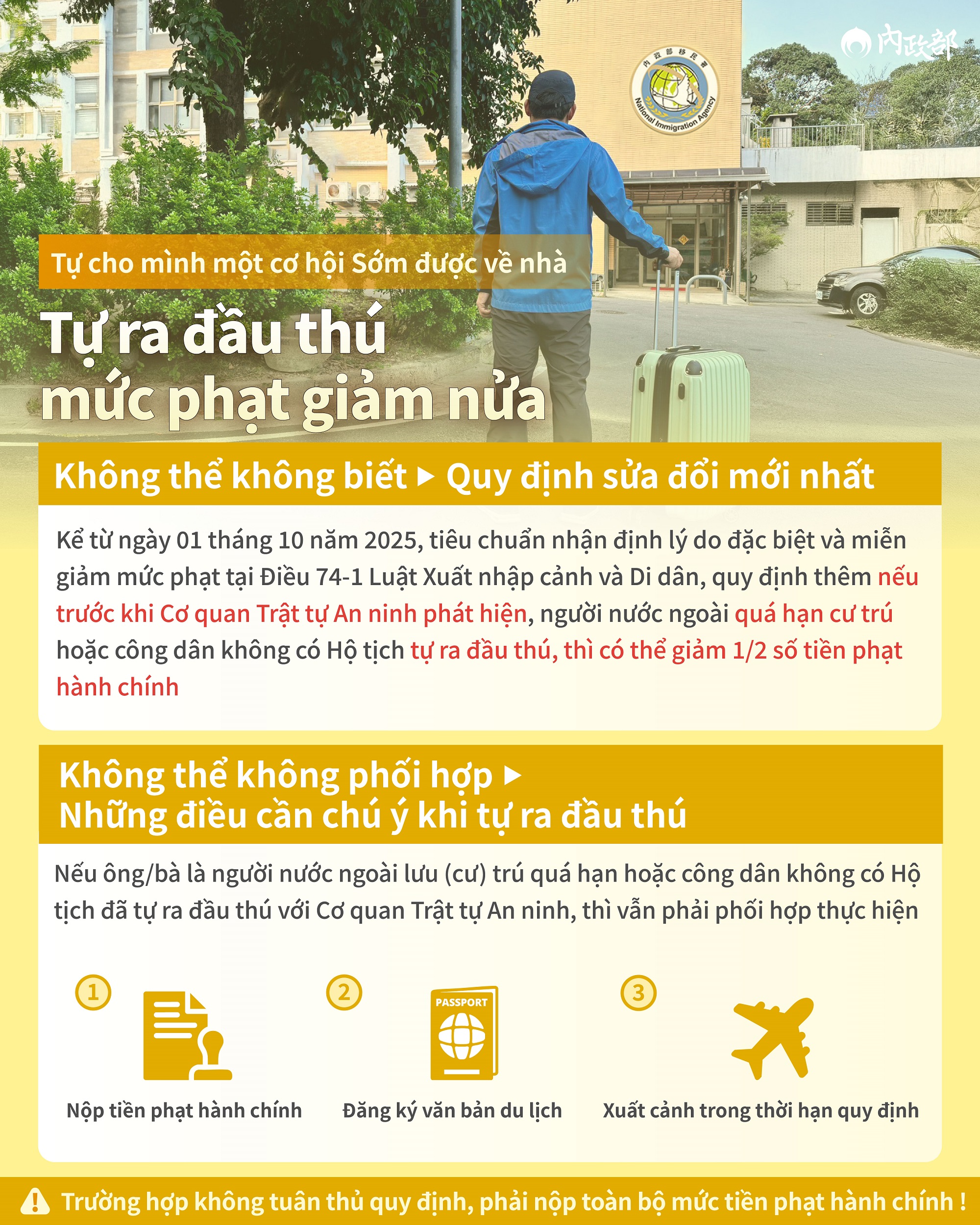 Kể từ ngày 01 tháng 10 năm 2025, tiêu chuẩn nhận định lý do đặc biệt và miễn giảm mức phạt tại Điều 74-1 Luật Xuất nhập cảnh và Di dân, quy định thêm nếu trước khi Cơ quan Trật tự An ninh phát hiện, người nước ngoài quá hạn cư trú hoặc công dân không có Hộ tịch tự ra đầu thú, thì có thể giảm 1/2 số tiền phạt hành chính