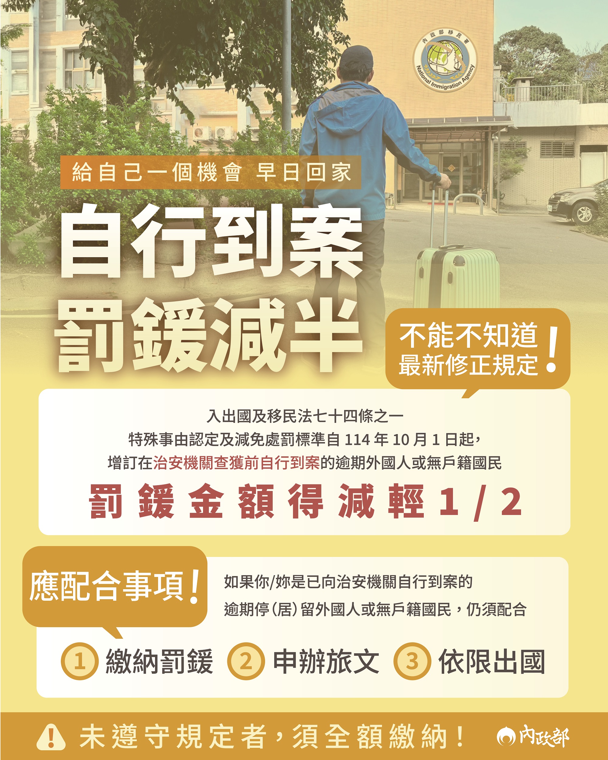 移民署為鼓勵逾期停(居)留外國人自行到案,於114年10月1日公告修正入出國及移民法第74條之1特殊事由之認定及減免處罰標準第3條第1項第7款規定略以,針對治安機關查獲前自行到案之外國人,且配合辦理各項出國事宜及依限繳納罰鍰者,得減輕應處罰鍰二分之一。